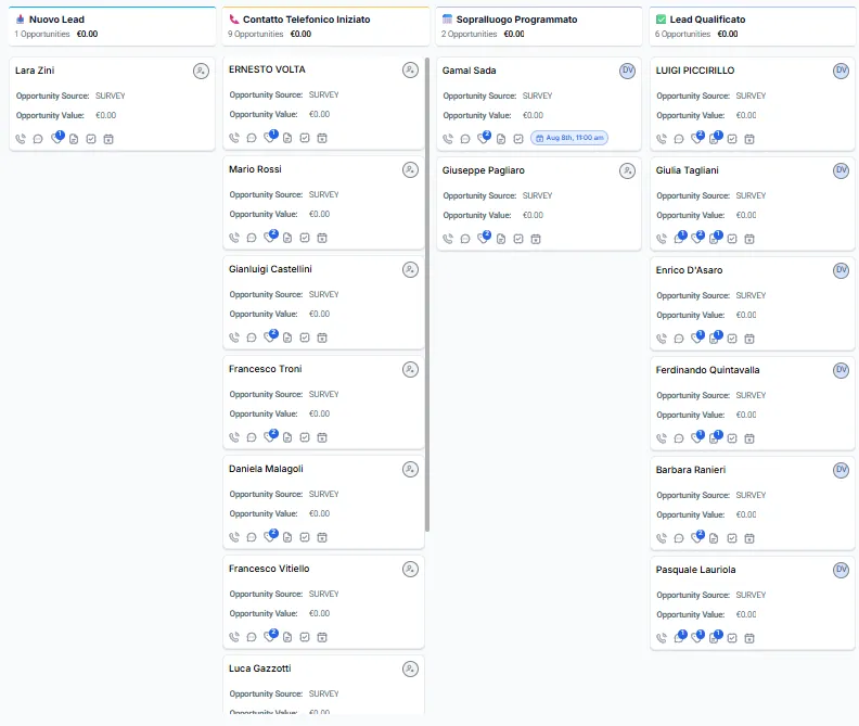 25 lead in ~3 settimane → 6 sopralluoghi (25% sopralluoghi)